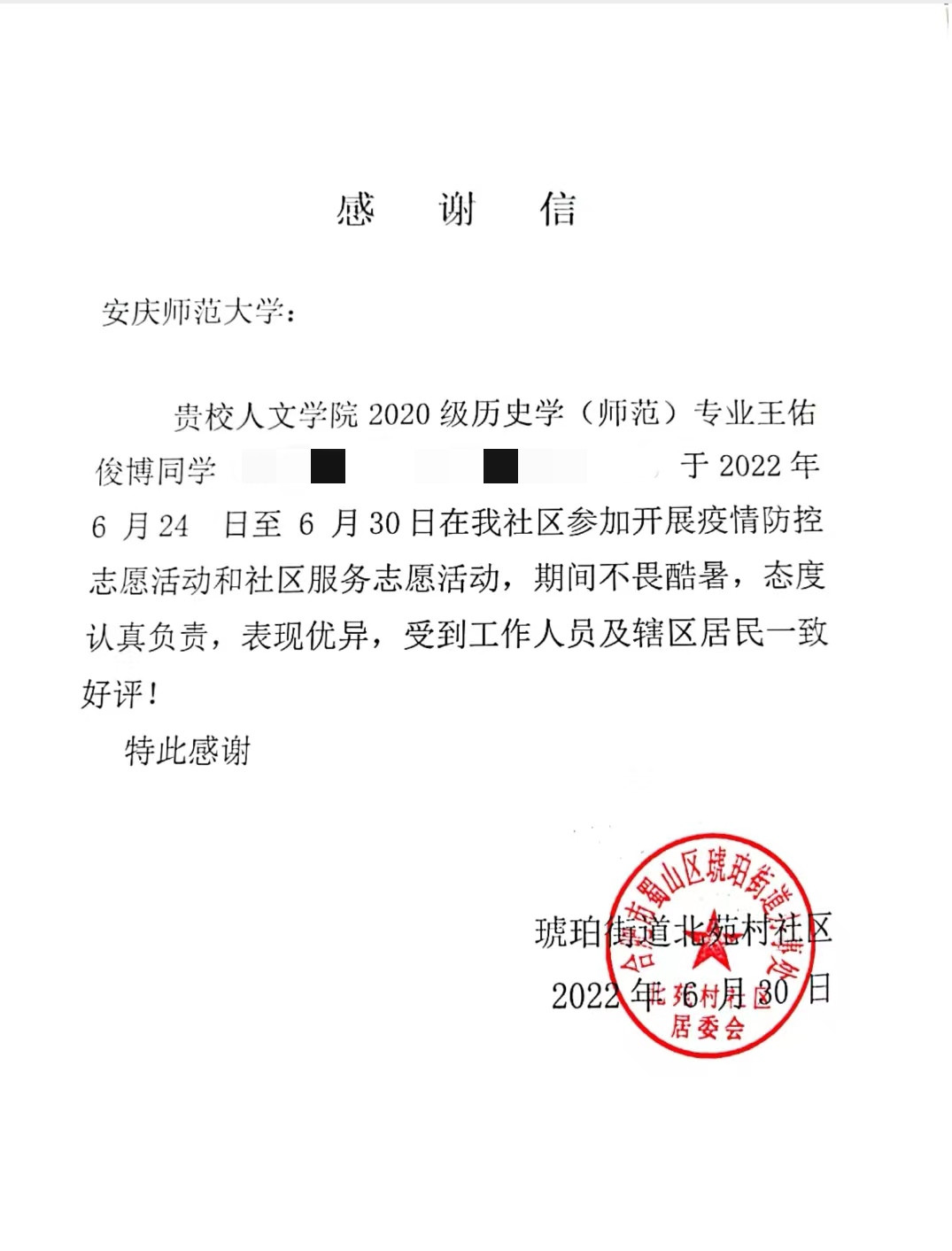 近日,必威西汉姆官网平台收到合肥市蜀山区琥珀街道北苑村社区的感谢信。信中对必威西汉姆官网平台2020级历史学专业王佑俊博同学暑期疫情防控志愿服务活动予以高度评价。