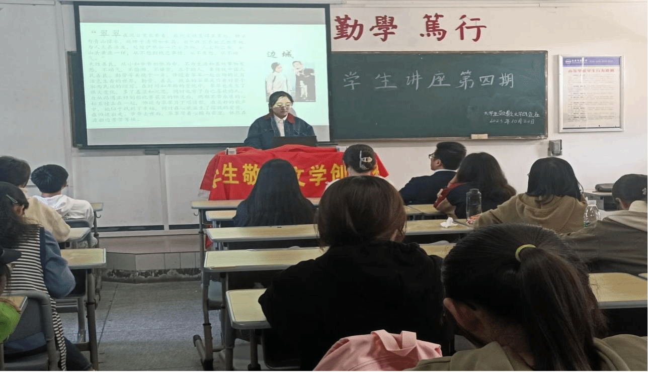 10月22日,大学生敬敷文学造社在教学楼311室举办第四期学生讲座,社长朱欣怡发表了题为“沈从文笔下的湘西女性形象及其审美意蕴”主题演讲。指导老师江飞教授莅临现场指导。