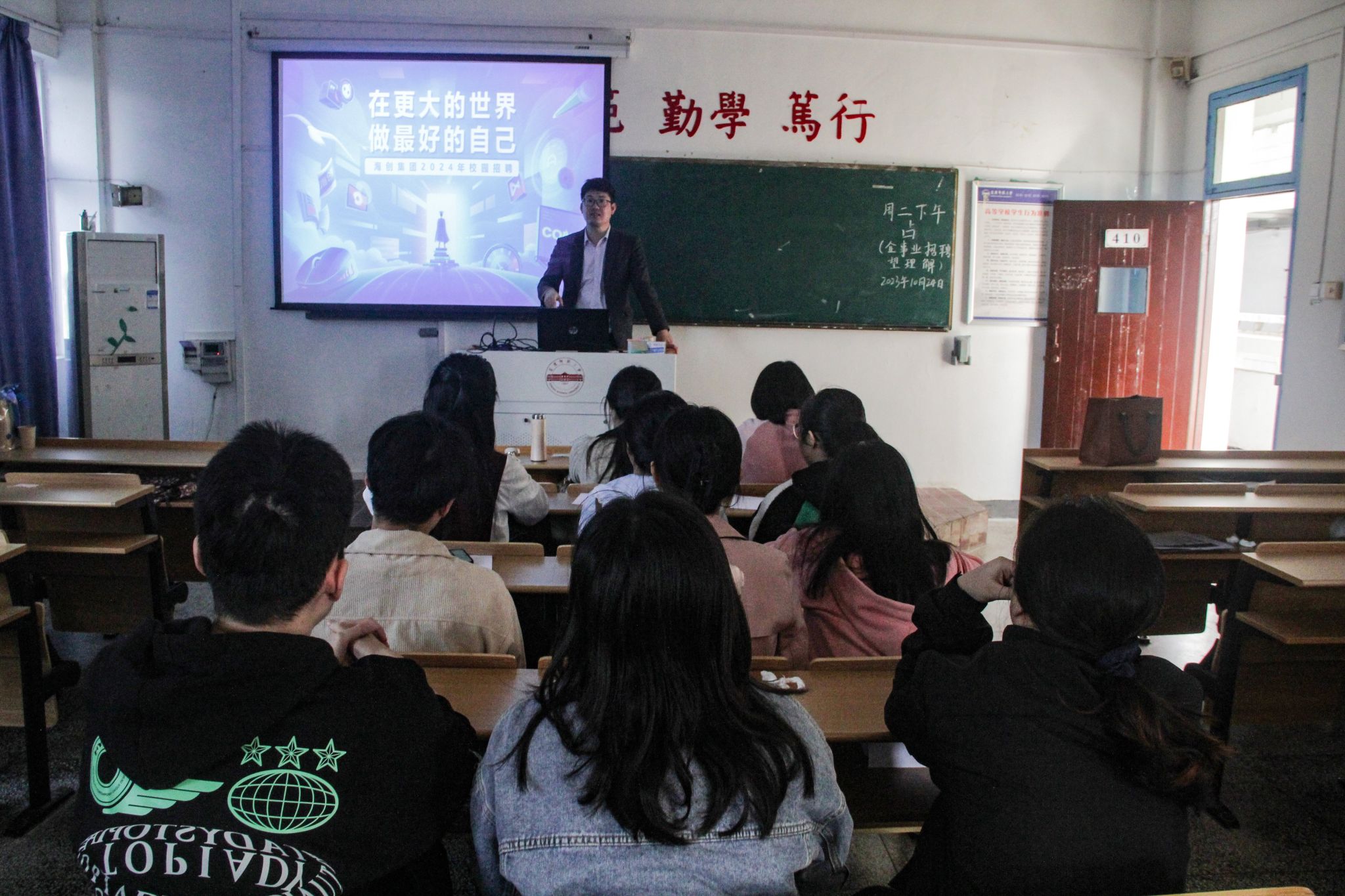 招聘会上,海创集团人力资源部经理吴杨先生通过PPT宣讲系统地介绍了公司的基本规制、业务范围等信息。关于平台发展问题,吴杨强调;“公司实行管理与技术双通道发展,对于师范生,本公司特别重视应聘者的语言表达能力和文字写作能力,除了提供文字相关的人事工作,还鼓励有能力者向管理方面努力。”