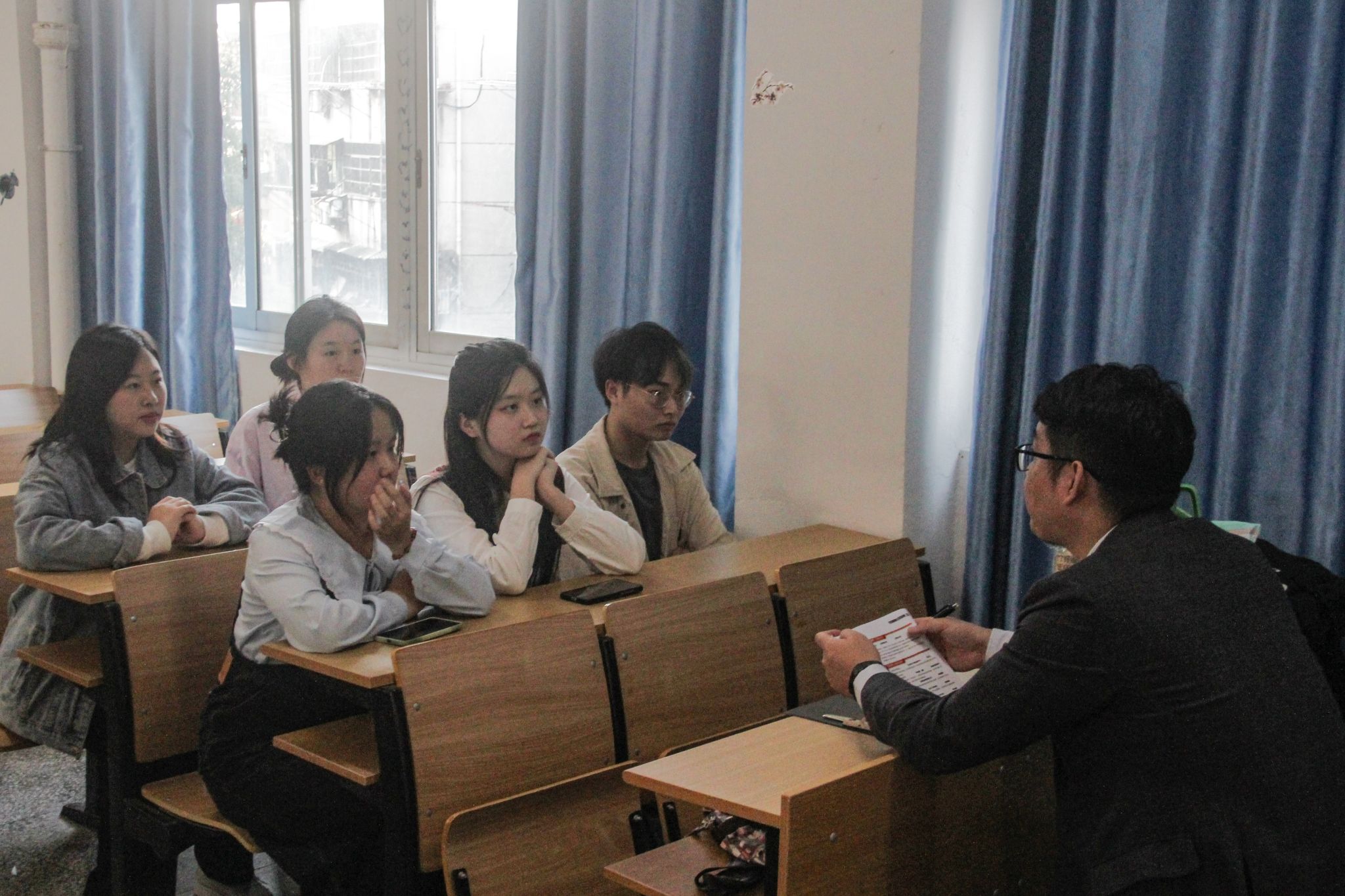“公司的试用期是怎样安排的?”“工作地点有哪些城市?”“实习期工资待遇怎么样?”“实习期提供住宿吗?”......在自由提问环节,台下毕业生就自己关心的问题提出了各自的疑问。吴杨和毕业生们面对面交流,耐心细致地回答了他们关心的问题。通过介绍,毕业生们对该公司有了初步了解,当场就有十余位同学递交了简历。吴杨将递交简历的毕业生分为两组,安排同学们依次进行自我介绍并谈谈理想的的工作条件。毕业生们从个人性格,家庭情况,学业成绩,获奖经历,任职经历,实习经历和未来工作意愿等方面条理清晰,大方自信地介绍了自己。