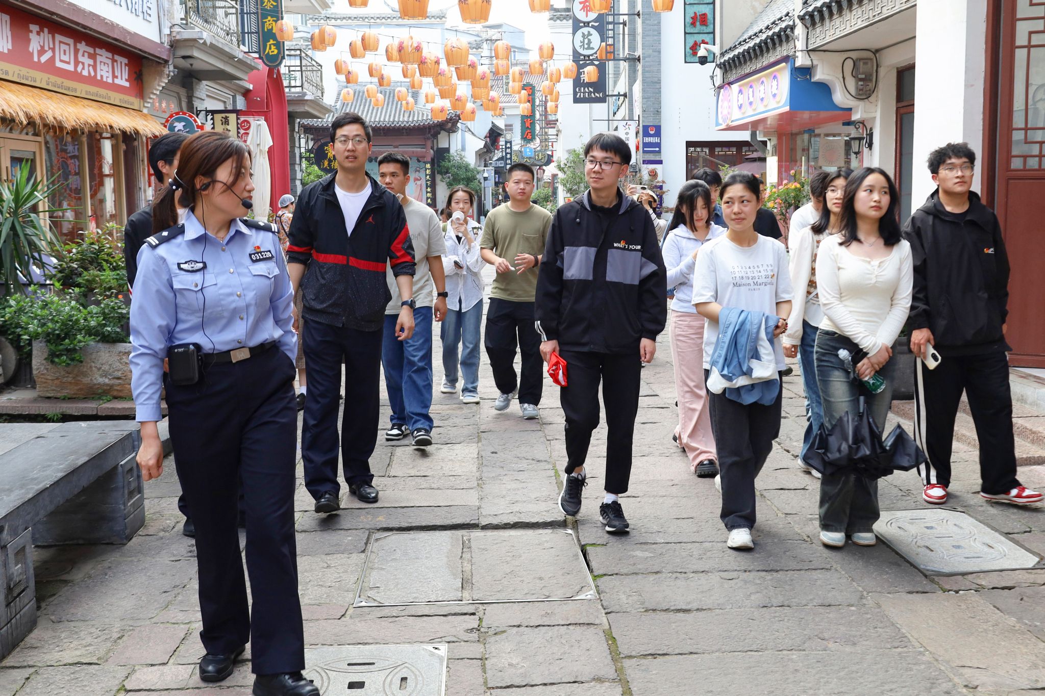“1897年,清代安徽办学规模最大、办学时间最长的省学“敬敷书院”移建于此,揭开了百年育人的序幕……”安庆市公安局迎江分区大南门派出所教导员张丽慧带领参与民警和学生先后参观了原国立安徽大学红楼、安庆市体育场(原黄家操场)、倒扒狮步行街以及国货街四个五四运动纪念地,分别介绍了各个地点对于中国近代历史进程的重要影响。