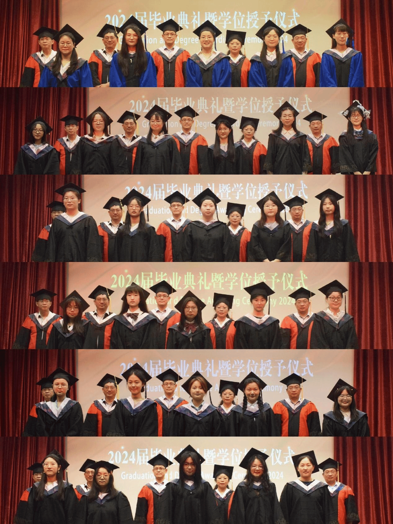 在分会场,2024届全体毕业生身着学士服,依次走上主席台,学院领导和导师代表们为其一一正冠拨穗,并授予学位证书,合影留念。