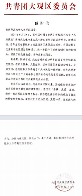 近日,大观区团委致函必威西汉姆官网平台,对我院青年学生在第十届中国(安庆)黄梅戏艺术节“热辣滚烫”黄梅戏文化市集活动中的志愿服务工作表示赞扬与感谢。