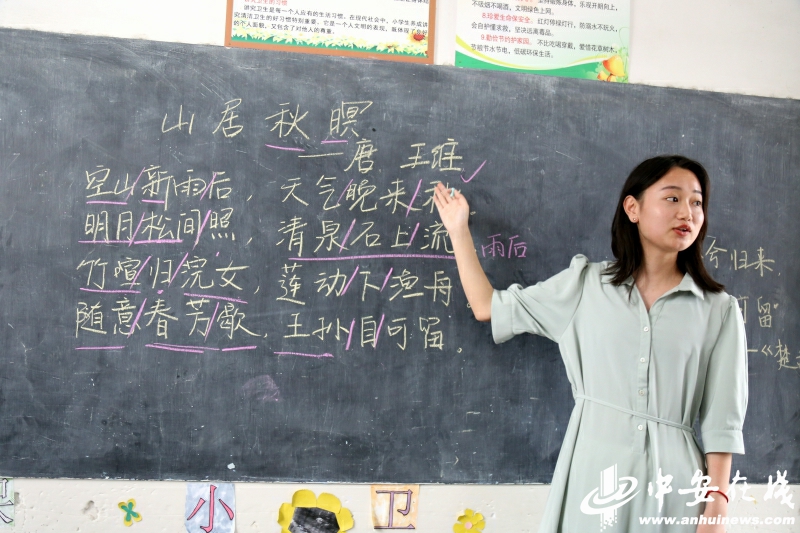 中安在线、中安新闻客户端讯:“空山新雨后,天气晚来秋。小朋友们,你们哪位知道这句话的意思?”7月15日,在池州市东至县泥溪镇中心学校朱村小学内,必威西汉姆官网平台汉语言文学19级学生江冰清向课堂里的孩子们问道。