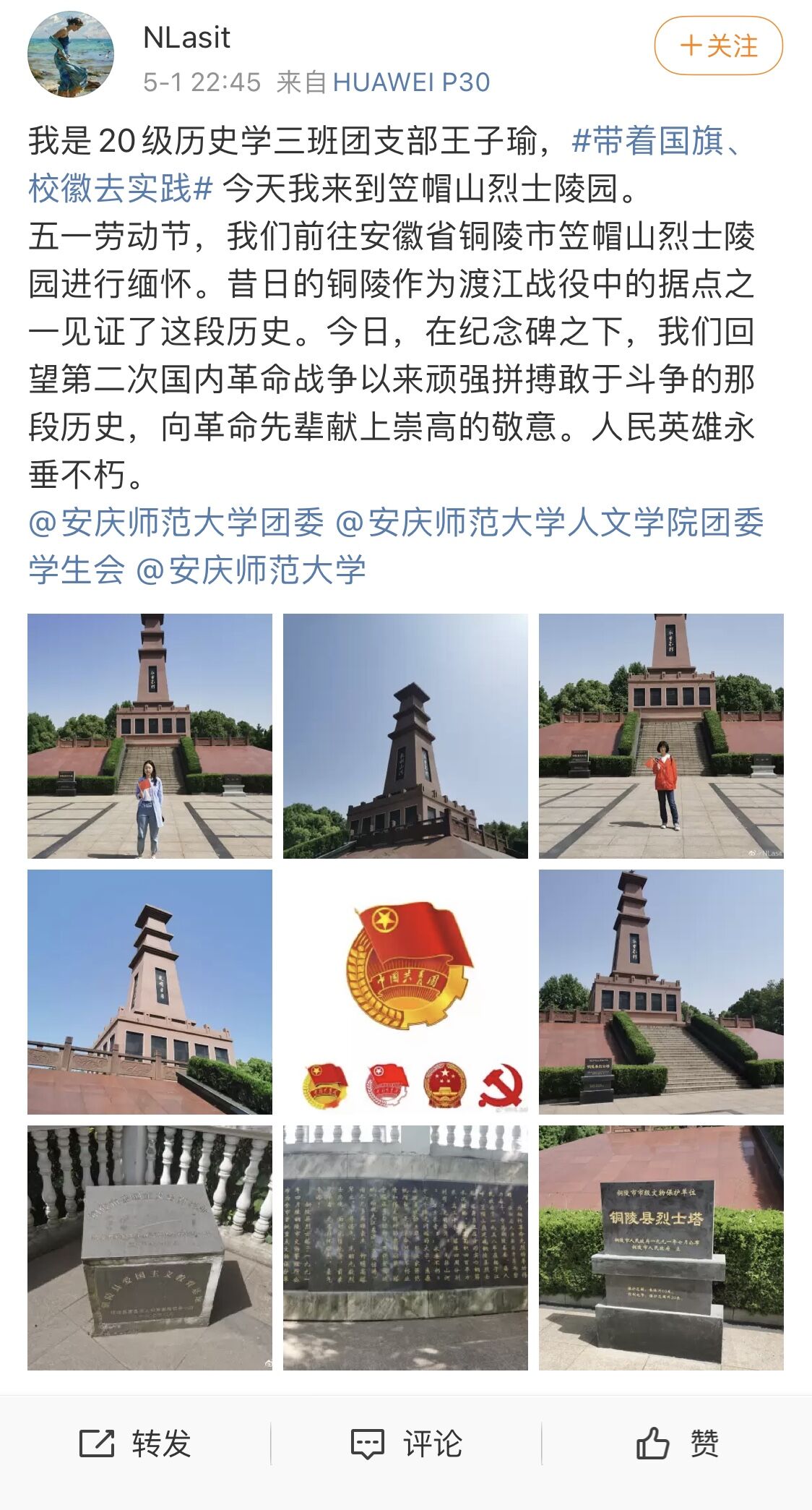 为深入开展党史学习教育,帮助青年学生增强爱党敬党意识,提升政治素养、网络素养,传播网络正能量,5月1日至5日,学院结合校团委精神的要求,开展“带着国旗、校徽去实践”图文征集活动。我院学生积极报名,踊跃参与。2019、2020级邱美玲、蔡洁、李士龙等同学自行选择黄镇生平事迹陈列馆、合肥渡江战役纪念馆等红色教育基地,佩戴校徽、团徽、学生证与国旗、团旗进行合影并写下文字感言,进行图文编辑后在新浪微博发表。