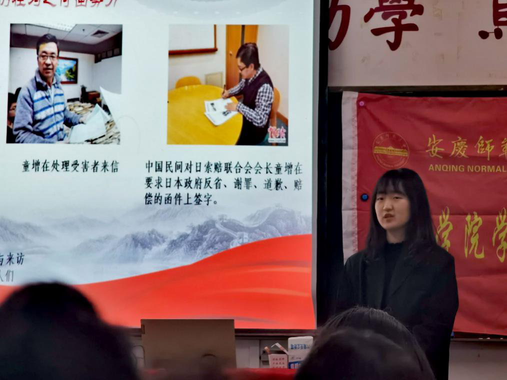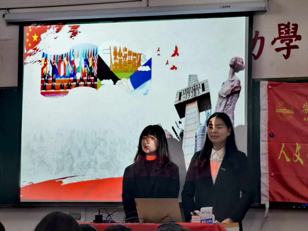 难忘金陵喋血,六朝烟雨同悲。宣讲人首先通过播放纪录片《1937南京记忆》,引出对南京大屠杀研究具有重大贡献的美籍华裔作家张纯如,并向大家详细介绍了这位勇于揭露侵华日军暴行的女英雄短暂而伟大的一生。