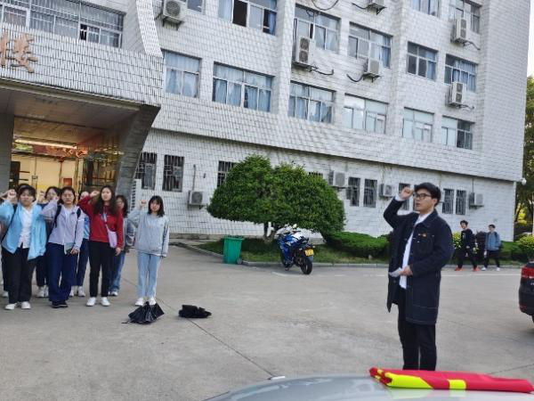 早上七点,必威西汉姆官网平台团委在教学楼前举行升国旗与重温入团誓词仪式。在庄严的国歌声中,五星红旗伴随着朝阳缓缓升起,2021级中国语言文学类四班全体同学伫立在国旗下,全体同学肃立,齐唱国歌,行注目礼。