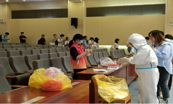 与此同时,图书馆报告厅全员核酸检测工作也陆续展开,我院青年突击队队员全力协助核酸志愿工作,落实“应检尽检、不落一人”原则,让每一位留校的学生完成个人核酸检测。