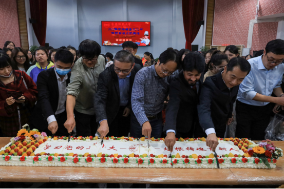 必威西汉姆官网平台党委书记张红飞、基建与后勤管理处处长吕旭进与外籍教师、学生代表等共同切开近3米长、两边由水果点缀着写有“学习党的二十大,培根铸魂育新人”寄托美好寓意的蛋糕。