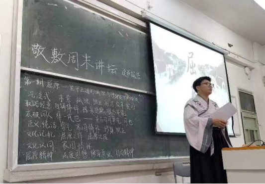 “我在第一部分结合了《史记·屈原列传》以及其他民间故事与组委会进行了艺术加工与创排,沉浸式代入屈原这一角色,与主创团队一起带领大家走进了战火纷乱的战国时期,希望能与大家一起深入感受屈原人生旅程中坚守正道的孤独与忠君爱国的昭质。第二部分则引经据典,结合文本具体分析了屈原的人生精神与思想内涵,以便同学们更深入地了解屈原。”负责人薛正阳在活动后分享道。