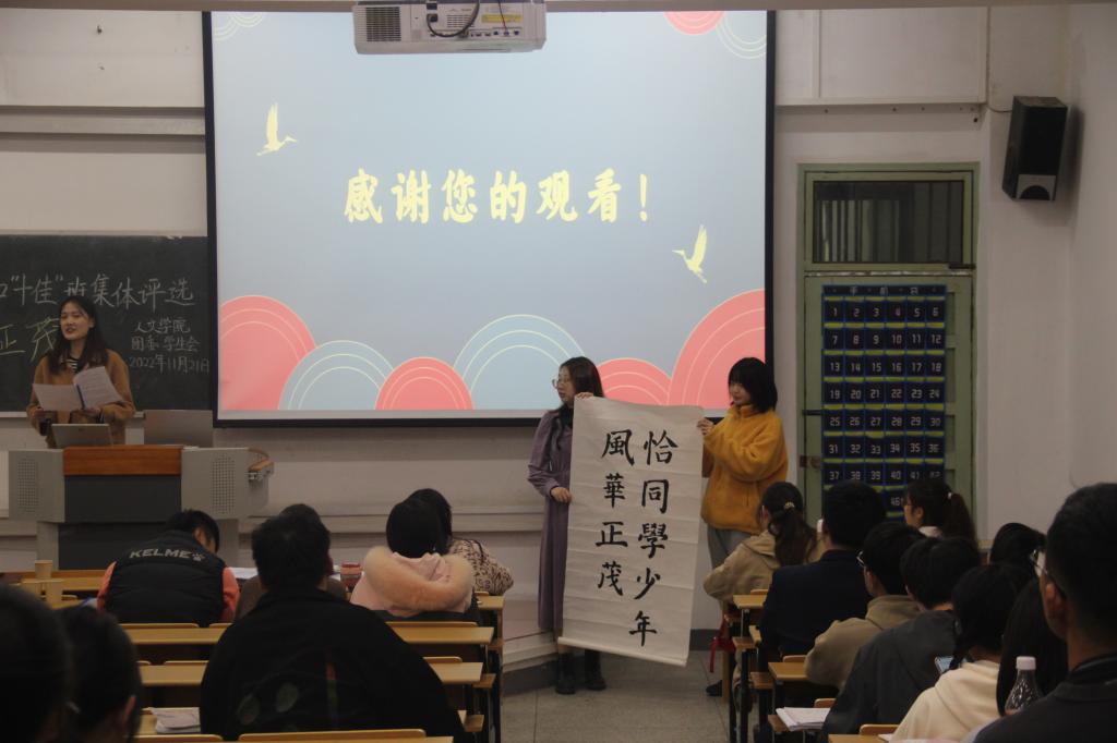各班通过列数据、制作饼状图等方式对四六级通过率、党团活动、体测达标和评优情况进行汇报。直观具体成果展示,体现了本班在德智体美劳多方面取得的丰硕成果。而乐器表演、书法展示更是把评选现场的气氛推向高潮。其中,2021级汉语言四班的汇报展示融合了磅礴大气的钢琴和宛转悠扬的古筝乐,充分展现必威西汉姆官网平台的文化专业底蕴,赢得了在场观众的阵阵掌声。