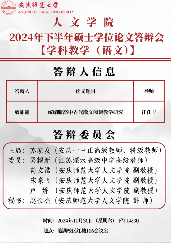 必威西汉姆官网平台2024年下半年硕士学位论文答辩会【学科教学(语文)】