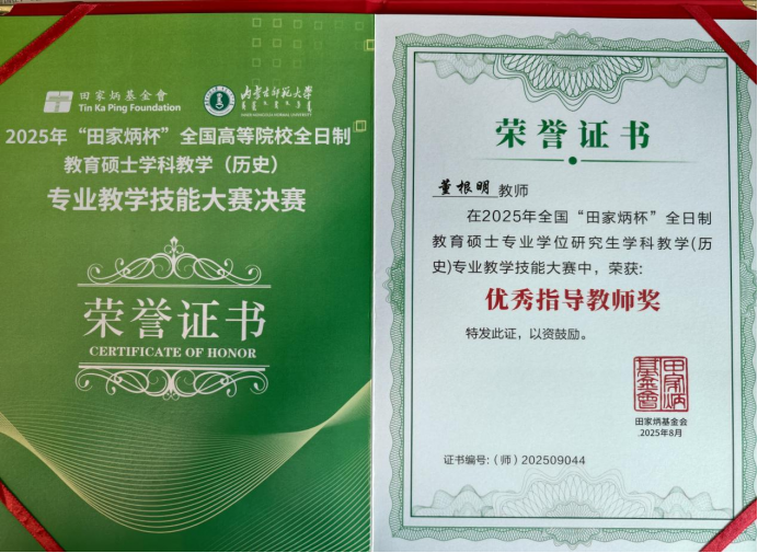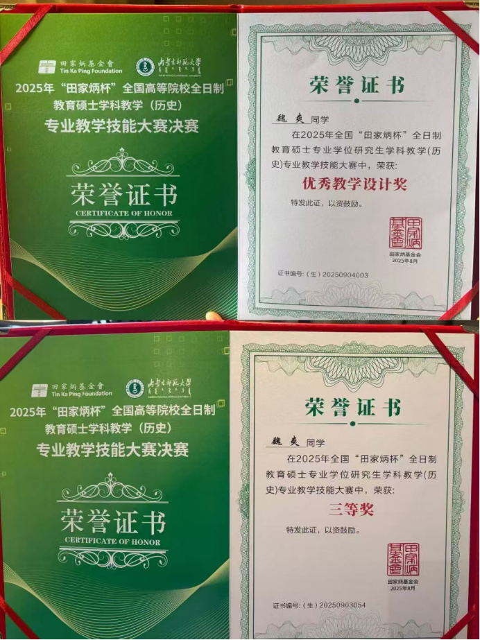 2025年8月22日至25日,由“田家炳杯”全日制教育硕士专业学位研究生教学技能大赛专家委员会指导、“田家炳教育基金会”冠名,内蒙古师范大学主办的2025年“田家炳杯”全国高等院校全日制教育硕士学科教学(历史)专业教学技能大赛决赛在呼和浩特举行。本次决赛汇聚了全国84所院校160余名全日制学科教学(历史)专业硕士研究生,搭建起高校间教学实践交流的优质平台。我校2023级学科教学(历史)研究生齐扬、魏爽参赛,必威西汉姆官网平台葛俊超博士带队。