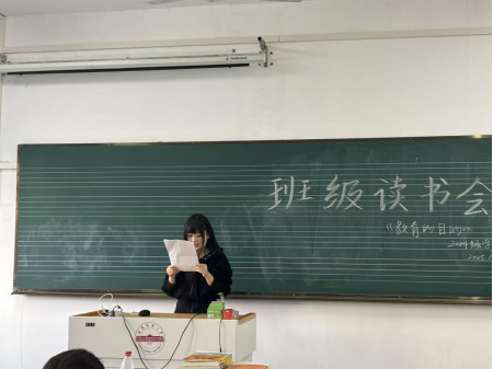 在分享环节中,桂乐乐、王艳、吴晓、任星雨、李娟五位同学依次上台,根据自己的读书体会,并结合自身经历,从不同角度对《教育的目的》进行了深入的思考。有的同学聚焦于书中“学生是有血有肉的人”这一核心观点,探讨了个性化教育的重要性;有的同学则对“教育节奏论”表现出浓厚兴趣,分析了浪漫、精确和综合运用三个阶段在学习过程中的具体体现;还有同学将书中的理论与当前的教育现实相联系,提出了自己的独到见解。