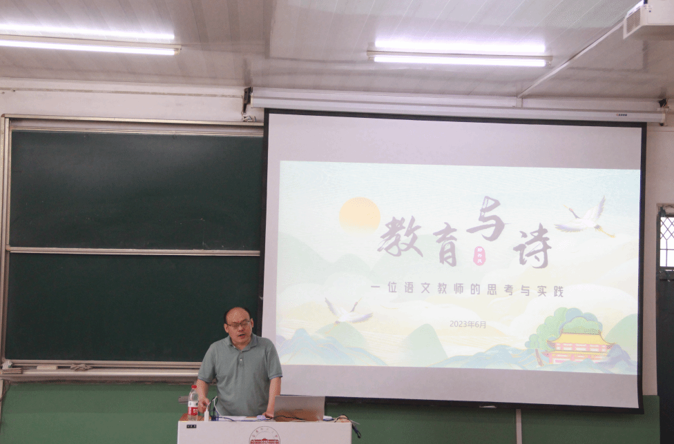 6月2日下午,文典·教育名家讲坛第二讲在菱湖校区化学楼理二阶开讲。本次报告邀请了安庆市第一中学副校长舒兴庆做题为“教育与诗——一位语文教师的思考与实践”的专题讲座。讲座由副院长金松林教授主持,我院学科语文、学科历史两个方向的硕士研究生以及部分本科生到场聆听学习。
