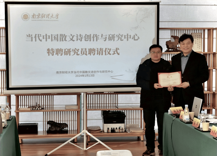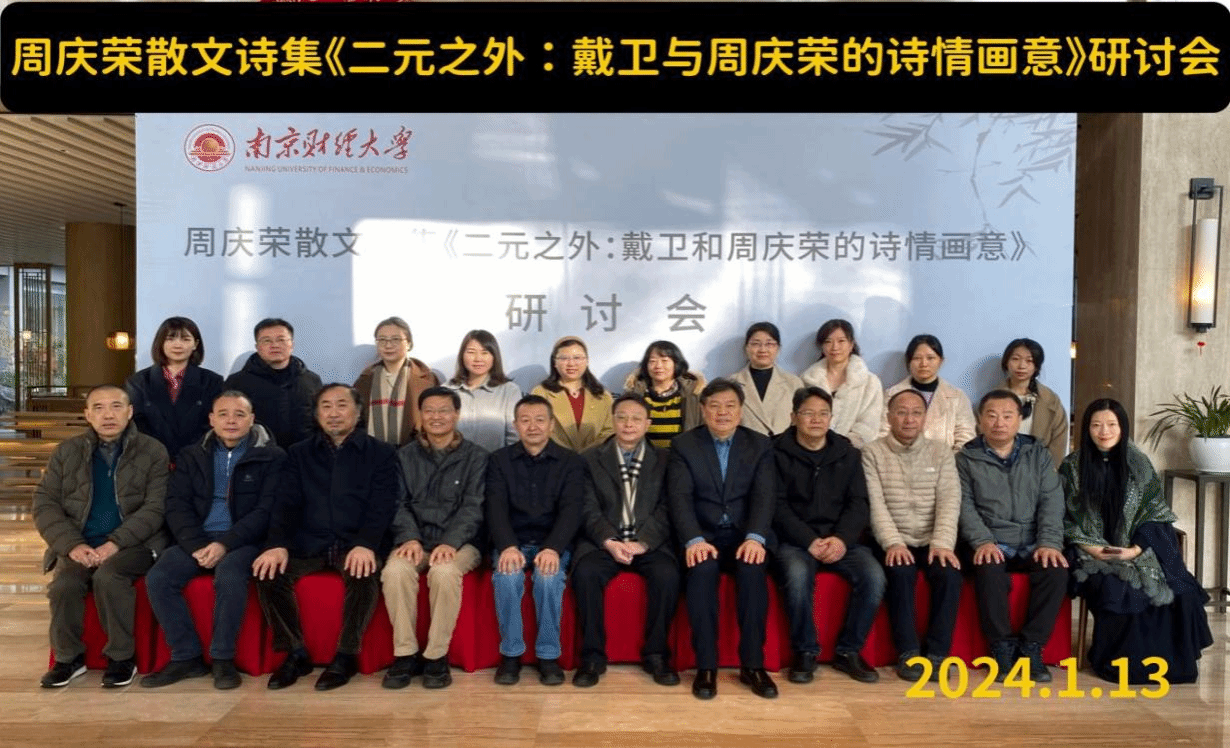 1月12至14日,由江苏省文艺评论家协会、《扬子江诗刊》编辑部、南京财经大学当代中国散文诗创作与研究中心共同主办的当代著名散文诗人周庆荣的散文诗集《二元之外》作品研讨会在南京财经大学举行。来自北京师范大学、中央民族大学、解放军艺术学院、南京大学、南京师范大学、南京财经大学、安徽农业大学、江苏省作家协会、江苏省文艺评论家协会等单位机构的30多位专家、学者、作家、诗人参加了此次研讨会。我院陈宗俊教授应邀参会,并提交会议论文《在有形中寻找无形——论<二元之外:戴卫与周庆荣的诗情画意>中散文诗创作》。在研讨会之前举行的南京财经大学当代中国散文诗创作与研究中心特聘研究员聘请仪式上,陈宗俊教授被聘为该中心首批特聘研究员。