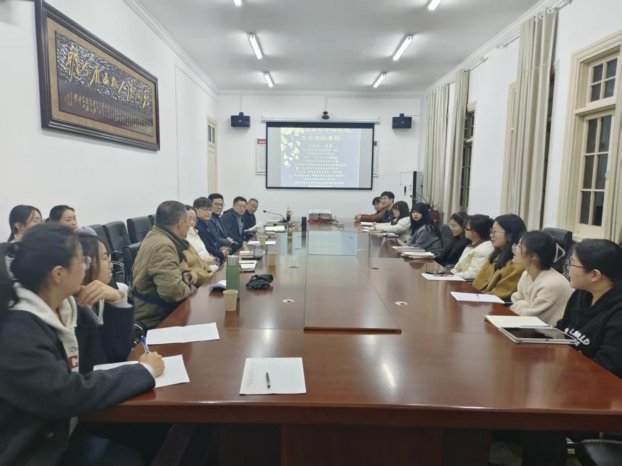 讲座伊始,陈宗俊教授对刘勇教授的到来表示热烈欢迎,并简要介绍了他在中国现代文学研究领域的深厚造诣与学术贡献。随后,刘勇教授从“文明互鉴”这一核心概念出发,指出其在当前国家文化战略背景下的重要意义。他引用胡适“以其所有,易其所无”的观点,强调文明互鉴的本质是双向选择与平等对话。然后,刘勇教授以中国现代文学史的编纂传统为切入点,对百年述史传统的进行了系统梳理了与反思。他指出:长期以来,中国现代文学史的编写大多围绕“三个十年”的时间框架来展开,虽然清晰勾勒出文学发展的基本轮廓,但同时在很大程度上遮蔽了中国现代文学发生过程中与中外文学之间复杂的互动关系,“外国经典的缺失”与“中国古代文学的缺席”就是其中两个突出体现。他以王瑶的《中国新文学史稿》、唐弢主编的《中国现代文学史》等文学史,严家炎、王富仁等学者的研究为例,对此进行了鞭辟入里的分析。他指出,鲁迅、周作人、郭沫若、郁达夫、茅盾、曹禺等现代文学大家,几乎人人兼具作家与翻译家的双重身份,他们的创作深受外国文学的滋养,与此同时他们也从未割裂与中国古典传统的血脉联系,其文学实践本身便是文明互鉴的体现。在重构文学史的方法方面,刘勇教授提出应拓宽研究视野、打破学科界限,建立“大文学观”,并以郭沫若为例,指出其文学与史学成就密不可分,应在跨学科视野中予以整体把握。在提问互动环节,刘勇教授就“大文学观”、研究生论文选题等问题与现场师生展开了热烈而深入的交流。