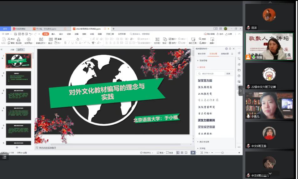 12月1日下午14时,敬敷人文讲坛第二十六讲顺利举行,北京语言大学文学院教授、博士生导师于小植应必威西汉姆官网平台邀请作了题为“文化教材编写的理念与实践”的线上讲座。本次讲座由张瑾博士主持,李金梅副教授与谈,该院部分青年教师、研究生和汉语国际教育专业本科生共50余人参与线上交流学习。