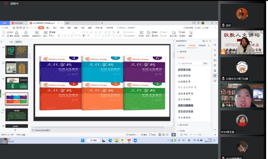 主讲人于小植教授以一则故事导入了“身教”重于“言传”的教育思想。紧接着,于教授回顾了新中国成立以来对外文化教材编写的历史,详细介绍了早期具有代表性的文化教材,如《汉语教科书》《汉语读本》《中国文明浅说》《中国文化面面观》等,并对这些教材做了相应的评述。然后,又从整体概况类教材、系统性文化教材、文化专题教材、交际类文化教材四个类型对90年代后的文化类教材进行分类介绍。通过分析梳理,于教授发现这些文化教材存在一些有待改进的问题,如未对教材难度和使用者的汉语水平作出明确界定,知识文化所占的比例远远多于交际文化,对于中国文化知识介绍的内容过于冷僻等。针对上述问题,于教授从编写内容、编写体例、编写理念等方面提出了有效的解决措施,她认为文化教材编写不仅要积极寻找传统文化与当代社会之间的生长点、交际文化和知识文化间的平衡点,还要充分尊重他国文化的主体性,树立“面向他者”的教学交往意识,讲述可供全世界分享的、饱含中国智慧的故事。讲座结尾,于教授向大家展示了她带领团队编写的国际中文教育文化教材《文化密码——中国文化教程》(共6册),该教材旨在通过一系列具有选择性、发展性、开放性、灵活性的文化主题体系,以帮助中文学习者系统性了解中国文化并在实际交往中成功实现跨文化交际。