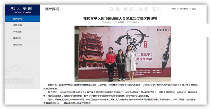 谢雪琴同学入选中央电视台举办的中国诗词大赛武汉赛区