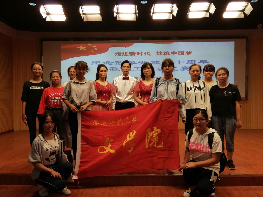 2018年9月28日,以“走进新时代,共筑中国梦——纪念改革开放四十周年”为主题,我校工会在龙山校区外国语学院503会议室举办了一场隆重的教职工朗诵比赛,文学院教师代表岳秀文、冯慧敏、熊言安在这场比赛中荣获一等奖。
