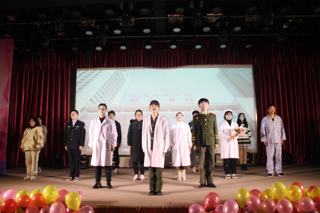 2019级汉语言文学一班艾宇龙说:“2020年是抗疫之年,在疫情期间,涌现出无数平民英雄,谱写了无数动人的篇章。为致敬这些伟大的英雄们,我院话剧社自编自导,原创话剧《黎明之前》。”话剧由警察在疫情期间阻止居民外出、军人母亲自愿奔赴抗疫前线、基层医生的防疫工作逐步得到群众理解等不同片段组成。演员们饱含深情,充分投入到表演之中,将观众带入不同的故事,再现了抗疫过程中医疗战士迎难而上和坚守岗位的感人画面,赢得现场一片掌声。