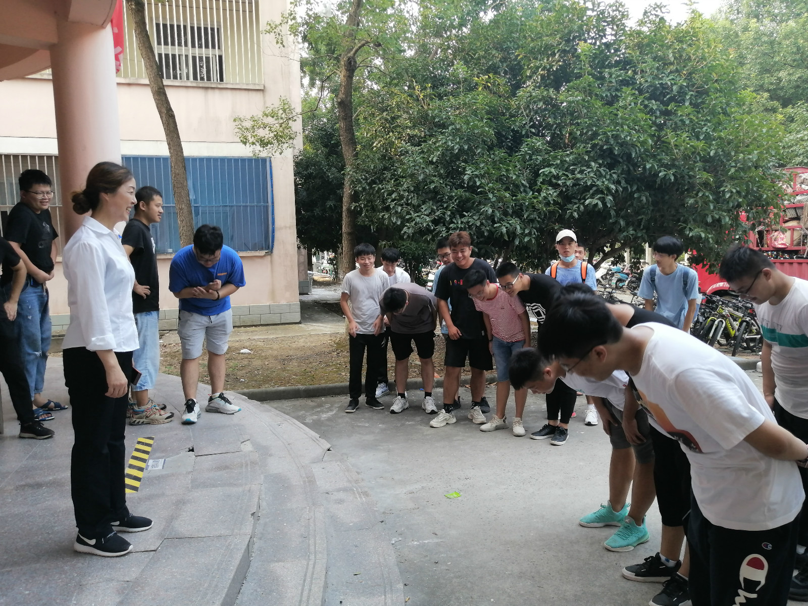 “杨阿姨您辛苦了,谢谢您这段时间以来对我们的照顾!” 8月25日上午,在龙山校区九号楼下,2019级历史学专业全体男生整齐列队,向宿管阿姨鞠躬致谢。