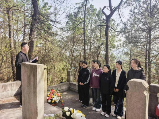 下午三时许,师生列队肃立于刘文典先生墓前。仪式伊始,主持人以“清明追思,慎终怀远”开篇,带领全体师生回顾刘文典先生毕生致力于国学教育与文化传承的卓然成就。先生“一字之微,征及万卷”的治学态度、“宁以义死,不苟幸生”的文人风骨,令在场学子肃然起敬。随后,全体师生默哀一分钟,墓园内鸦雀无声,唯闻清风拂叶,寄托着后辈对先贤的无尽追思。