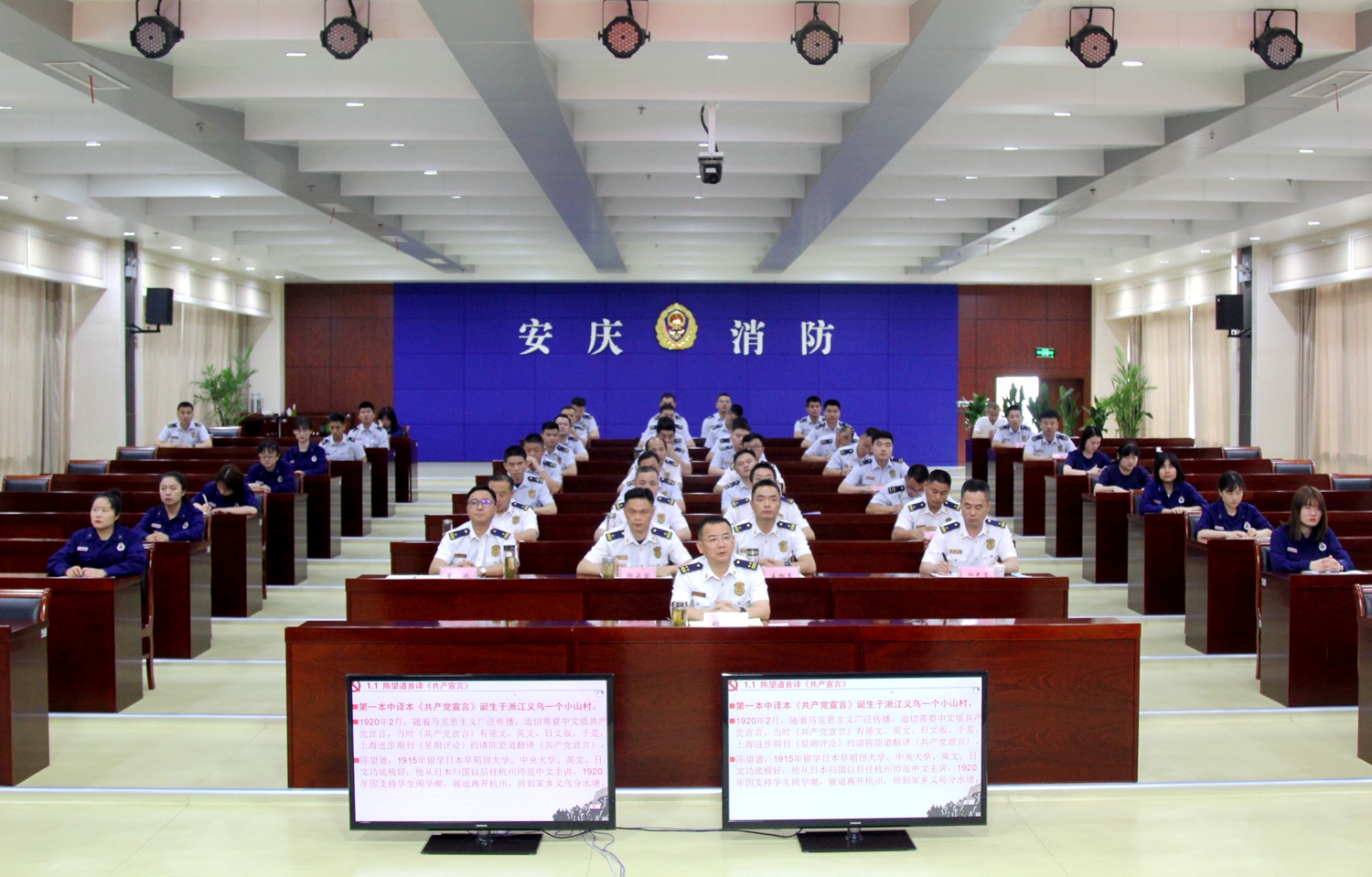 作为双方共建实践基地的重要内容之一,必威西汉姆官网平台组织专业教师队伍,赴安庆消防救援支队开展党史宣讲,践行党史学习的时代使命。在活动之初,校地双方通过细致深入沟通,针对党史学习的基本要求,初步拟定党史宣讲方案。整个宣讲按照中国共产党百年发展历程,同时结合党史学习途径的多样化需求,基本确立了“百年党史的通史+地方党史”讲授体例。内容主要涵盖中国共产党成立以来的百年辉煌历程,结合安徽地方红色革命文化资源(大别山红色精神、渡江精神、小岗精神)以及安庆地方党史的特色内容。在充分酝酿的基础上,宣讲内容精选凝练出“日出东方”“古田会议”“长征力量”“解放战场”“新中国辉煌”“改革开放”“新时代信仰”等10个专题。同时,为了增强党史宣讲实效,在党史内容遴选和宣讲方式方面坚持政治性、科学性、历史性、通俗性等。党史内容精选影响中国共产党发展沿革的重大史实和关键节点,以点带面,提纲挈领地刻画出中国共产党这个百年大党的历史轨迹。此外,党史宣讲在突出党史逻辑线索基础上,穿插生动通俗的党史故事,以通俗易懂的党史细流沁润消防救援人员的心田。