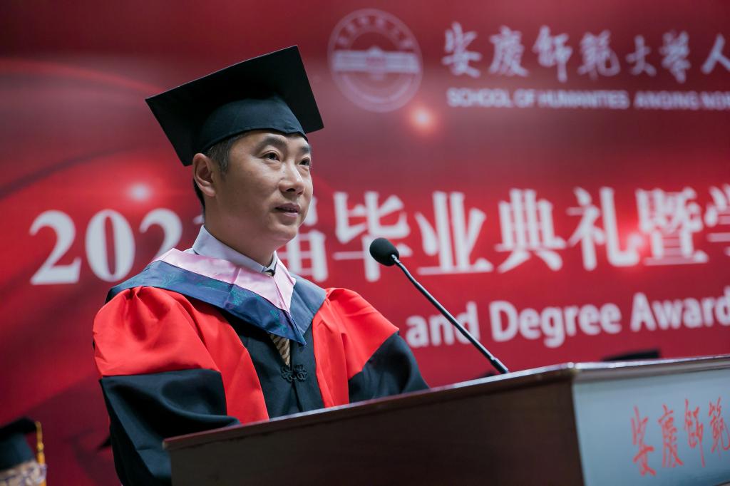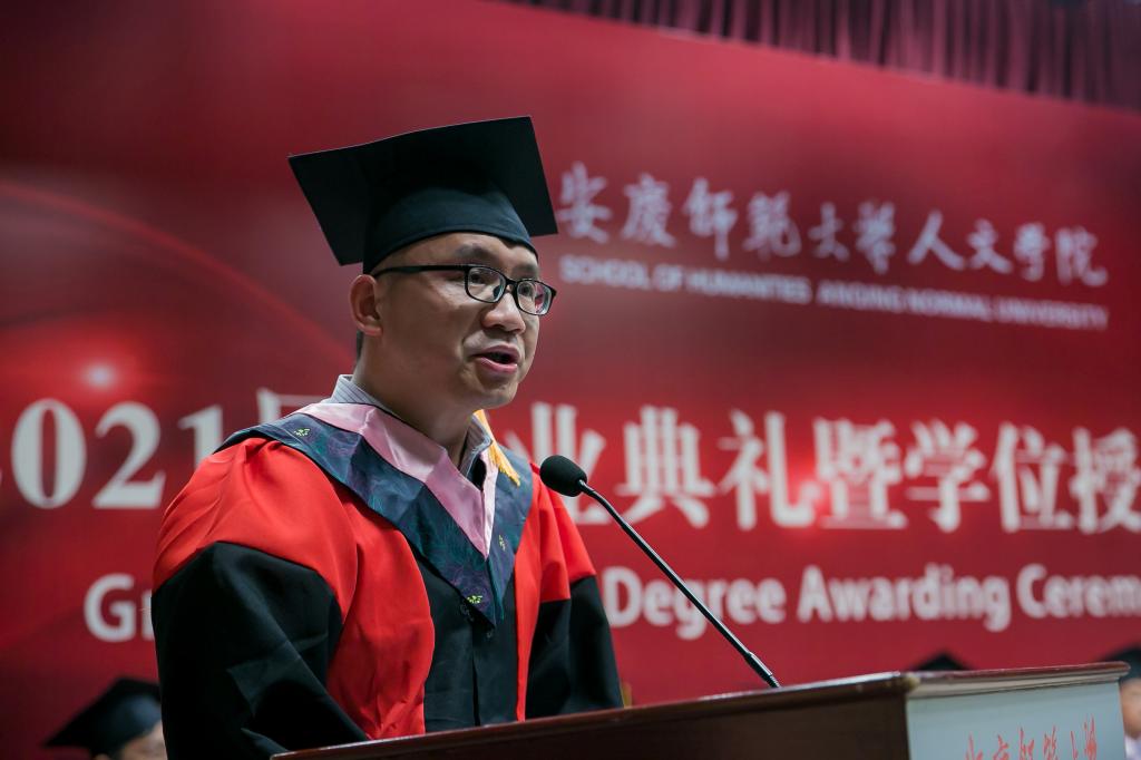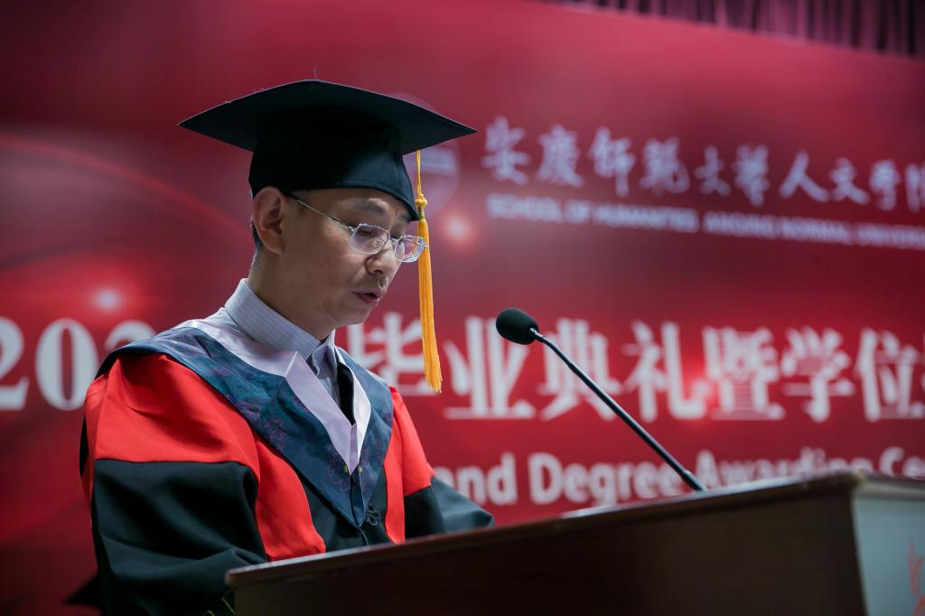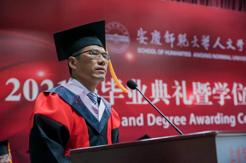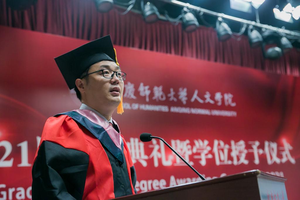 校“三全育人”最美教师、必威西汉姆官网平台教授、硕士生导师江飞作为教师代表为毕业生送上祝贺与期待。他勉励毕业生永远不要忘记自己作为人文知识分子身份和责任,成为一个脚下有根心中有光的人。