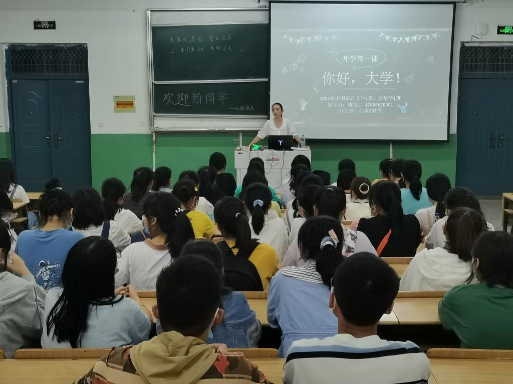 班会上,辅导员们就自身工作、班级管理等规章制度做了强调,向新生们介绍大学的基本信息和规划方向。然而,惊喜总是在不经意间,汉语言文学专业2020(1)班的陆悦然和汉语言文学2020(3)班的盛阳阳作为学生助理,和辅导员们相互配合,为两位“寿星”准备生日会。