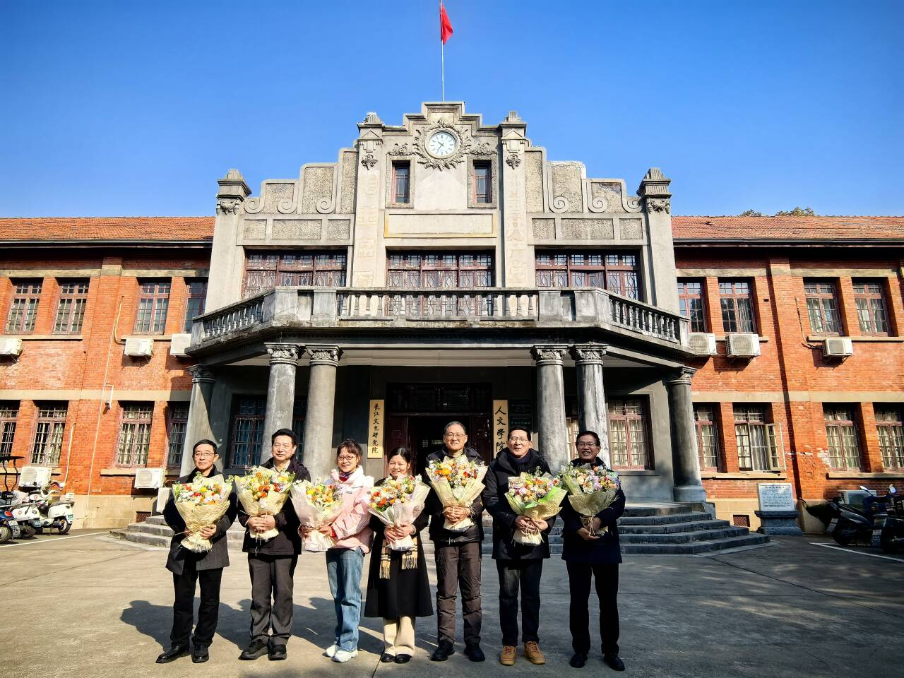 (合影左起:安刚强副教授,陈世庆教授,张俊副教授,方晓珍教授,汪祚民教授,李义中教授,江贻隆副教授)