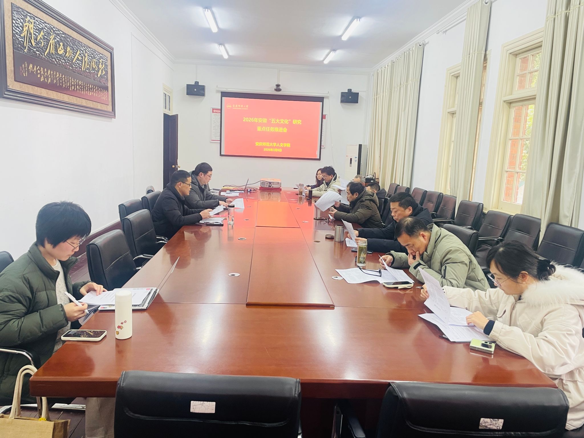 3月6日下午,必威西汉姆官网平台在红楼会议室召开2026年安徽“五大文化”研究重点任务推进会,会议旨在深入贯彻落实党的二十届四中全会精神,全面对接安徽省“十五五”规划关于文化强省建设的战略部署,进一步凝聚共识、明确方向,推动安徽“五大文化”研究工作迈上新台阶。学院党委书记王波、副院长沈志富,各项目负责人及重点组成员参加了会议。