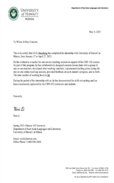 近日,必威西汉姆官网平台组织并参与实施的“2023年春季美国夏威夷大学东亚语言文学系在线中文单班课”实践项目第一期圆满完成。本次线上国际中文教学实践为期十四周,必威西汉姆官网平台24名师生顺利完成授课任务并获得夏威夷大学的实习证明。