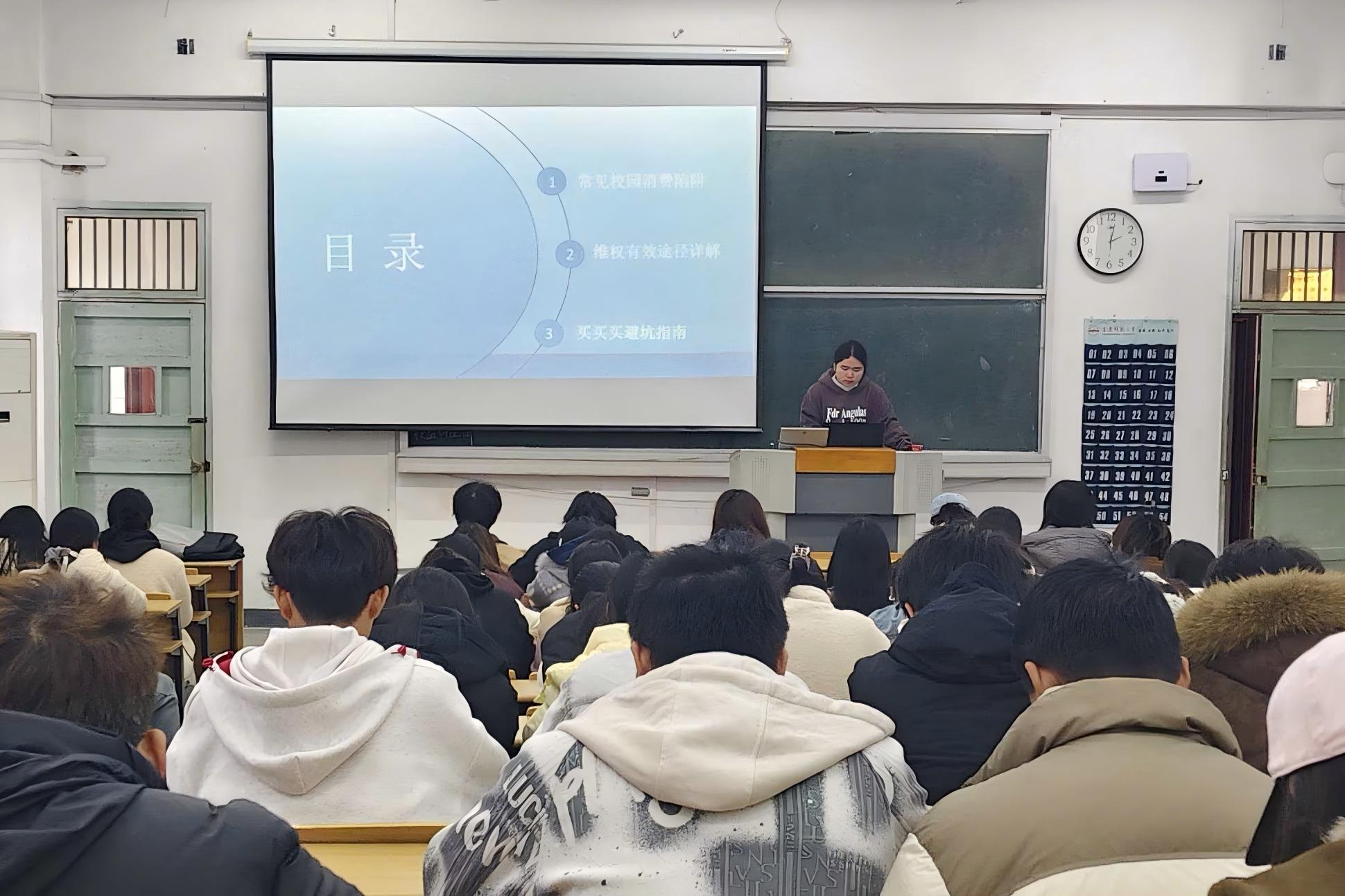 讲座围绕常见校园消费陷阱、维权途径、消费指南,用真实案例介绍了青年学子身边常见的消费陷阱,梳理了保留消费凭证、与商家协商、向平台投诉、拨打12315热线等维权步骤,明确了大学生维权的合法途径与注意事项。