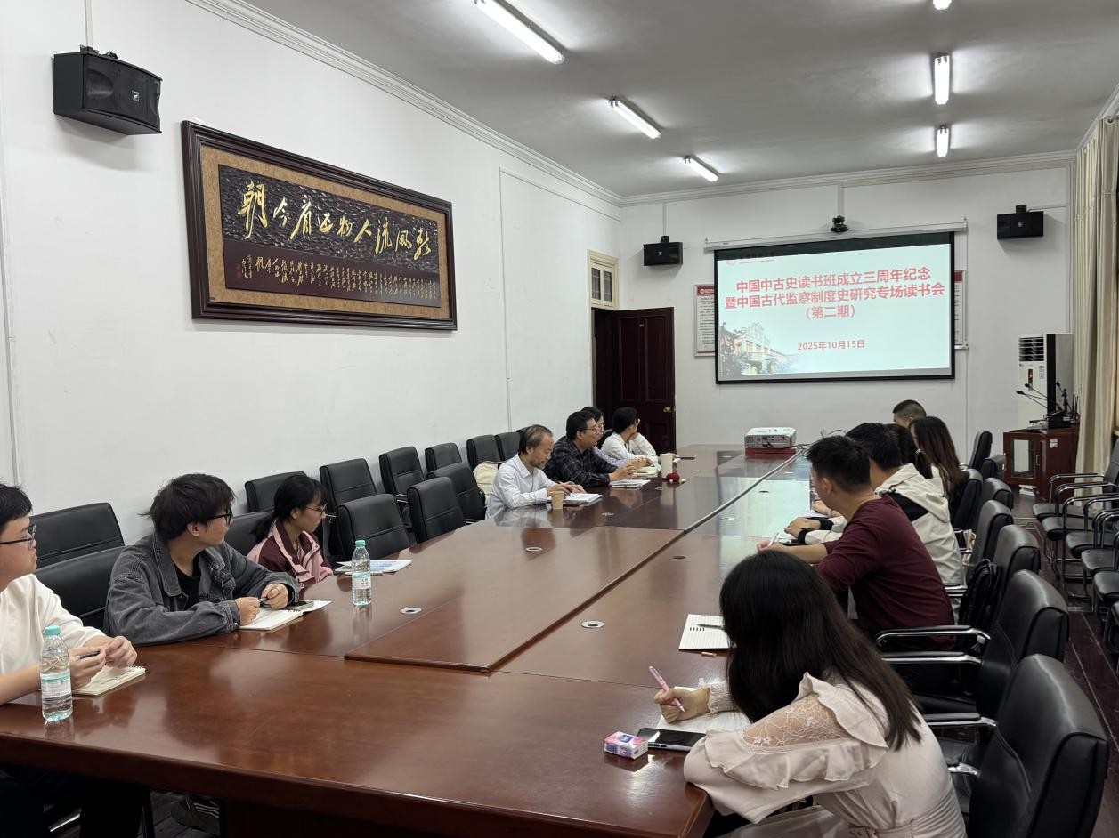 10月15日下午,由国家社科基金重大招标项目“中国古代监察制度变迁的历史源流”课题组、bw必威西汉姆联中国中古史研究中心主办,bw必威西汉姆联廉洁文化研究院协办的中国中古史读书班三周年纪念暨中国古代监察制度研究(第二期)专场读书会在菱湖校区红楼二楼会议室顺利举行。中国中古史研究中心主任李正君博士、必威西汉姆官网平台吴海波老师以及部分师生参加此次读书会。读书会由李正君博士主持。