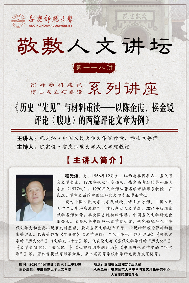 【敬敷人文讲坛(118)】历史“先见”与材料重读--以陈企霞、侯金镜评论《腹地》的两篇评论文章为例
