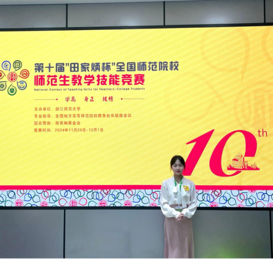 2024年11月29日至12月1日,由全国地方高等师范院校教务处长联席会议指导、“田家炳”基金会冠名,浙江师范大学主办的2024年第十届“田家炳杯”全国师范院校师范生教学技能竞赛决赛在浙江金华举行,我院2021级历史学(师范)赵颖同学参加本次决赛并获得二等奖。