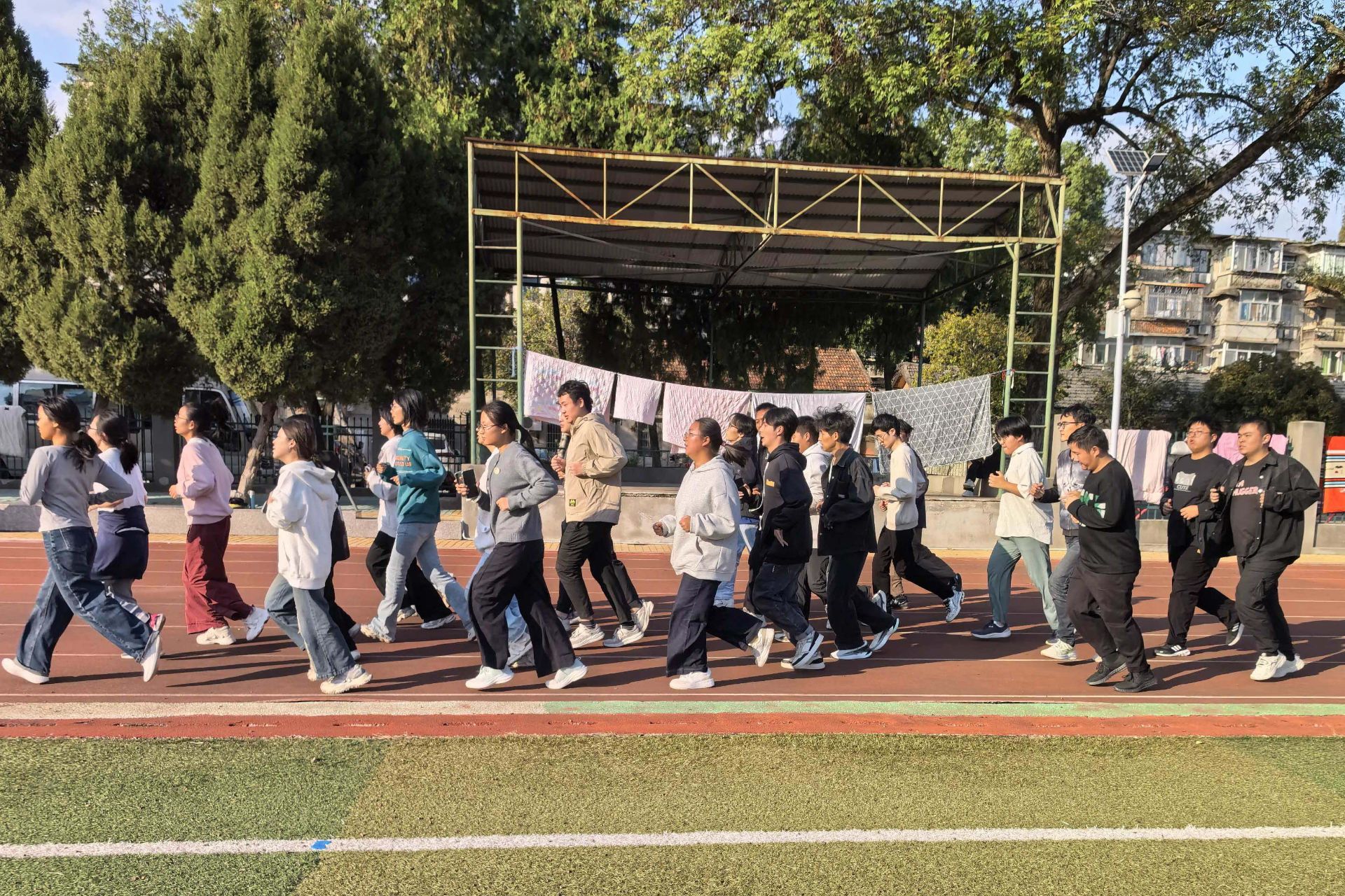 活动开始,学院体育运动指导教师潘源针对同学们跑步中易出现的耐力不足、节奏不稳等问题进行现场示范与指导,帮助同学们掌握正确的摆臂、跨步动作与呼吸方法。“经过老师的点拨,我纠正了错误的姿势,运动节奏感觉更顺畅了。”2025级中国语言文学类专业文典班的薛佳同学说。