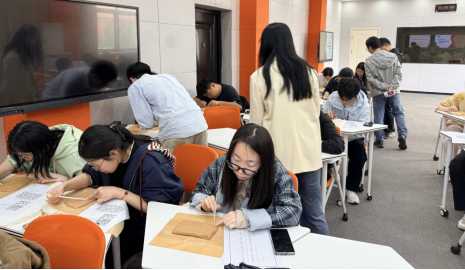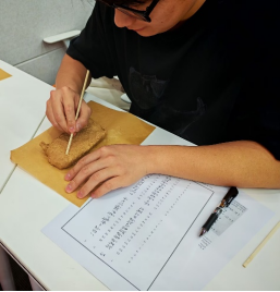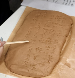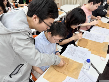 在教学实操环节中,詹瑜松博士现场示范泥板制作流程和楔形文字刻画方法,并指导同学们亲手完成泥板压制、文字刻写等操作。同学们认真体验古代书写材料的质感与文字刻画的技巧,在实践中感受古代文明的独特魅力,进一步加深了对世界古代史相关知识的理解。现场气氛热烈,互动频繁,教学效果良好。