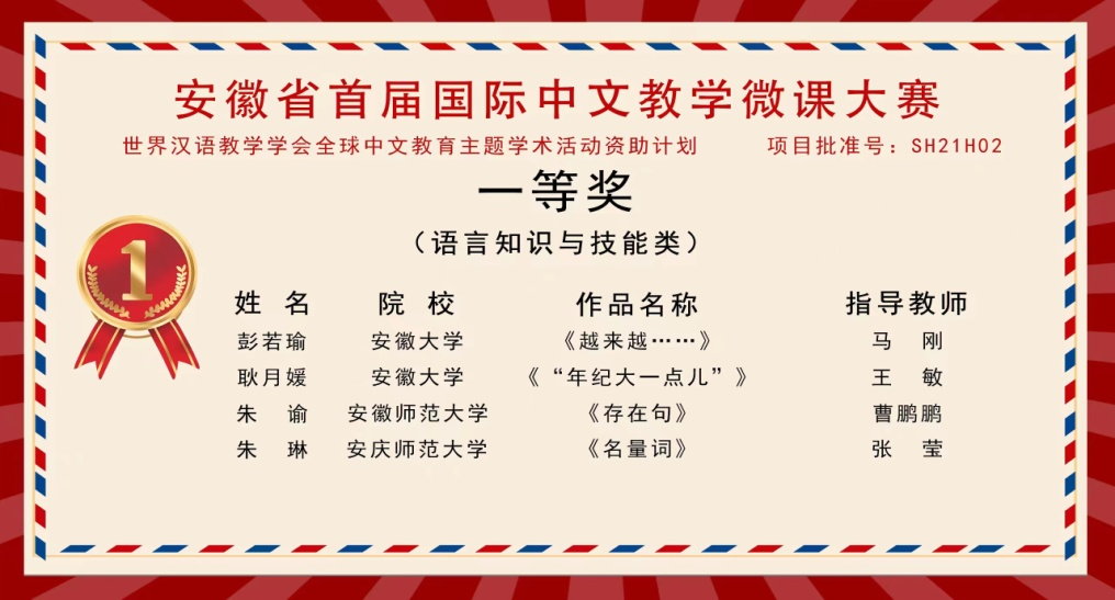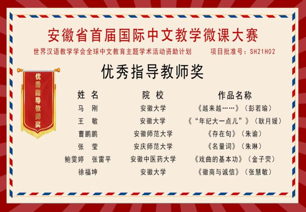 2022年11月20日,由世界汉语教学学会全球中文教育主体学术活动资助、安徽省汉语国际教育研究会主办、安徽大学文学院和安徽农业大学外国语学院承办的安徽省首届国际中文教学微课大赛评选结果揭晓。必威西汉姆官网平台2019级汉语国际教育专业朱琳同学荣获一等奖;2019级汉语国际教育专业梁嘉越同学、朱慧同学荣获优秀奖;张莹老师荣获优秀指导教师奖。