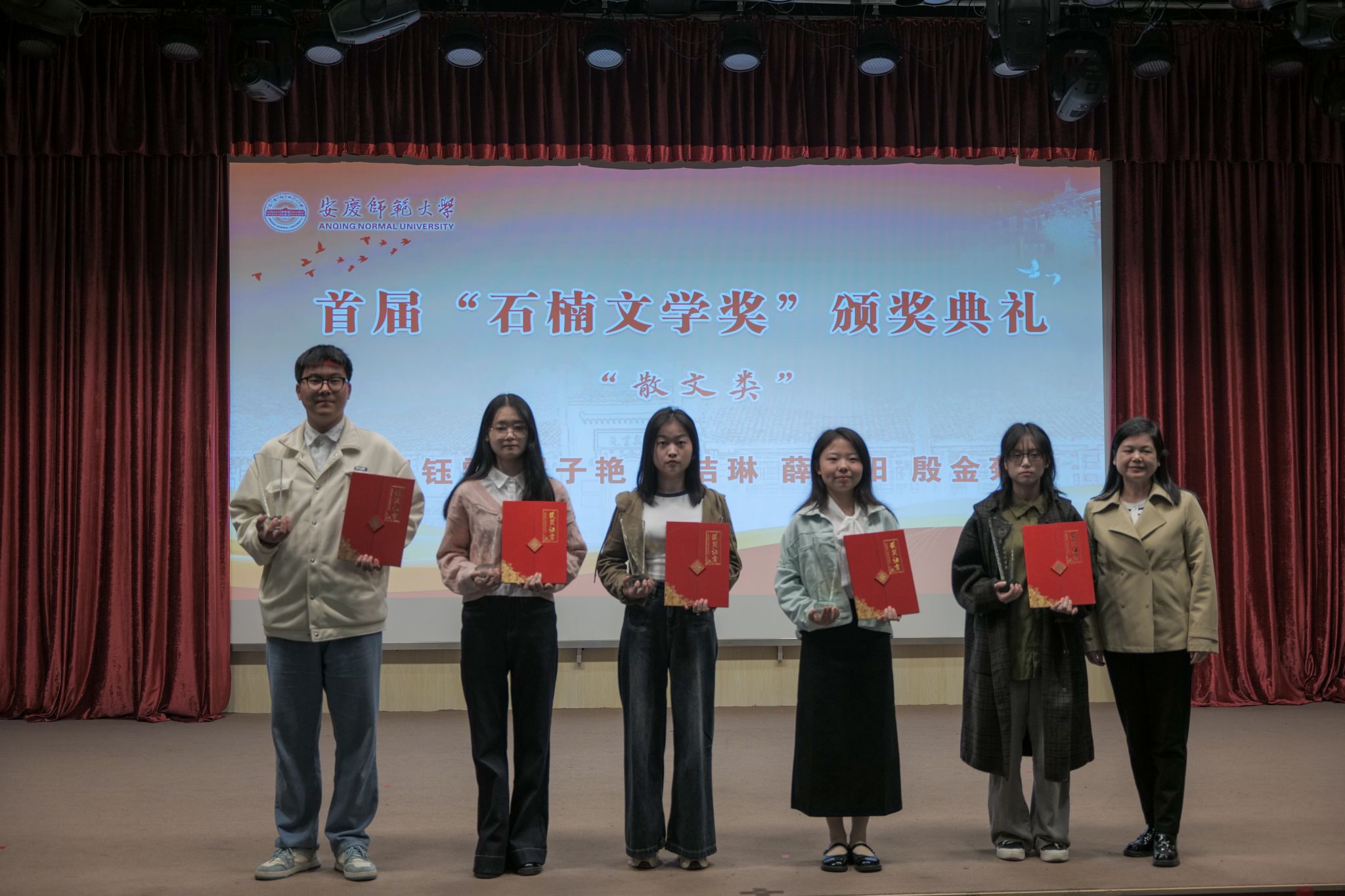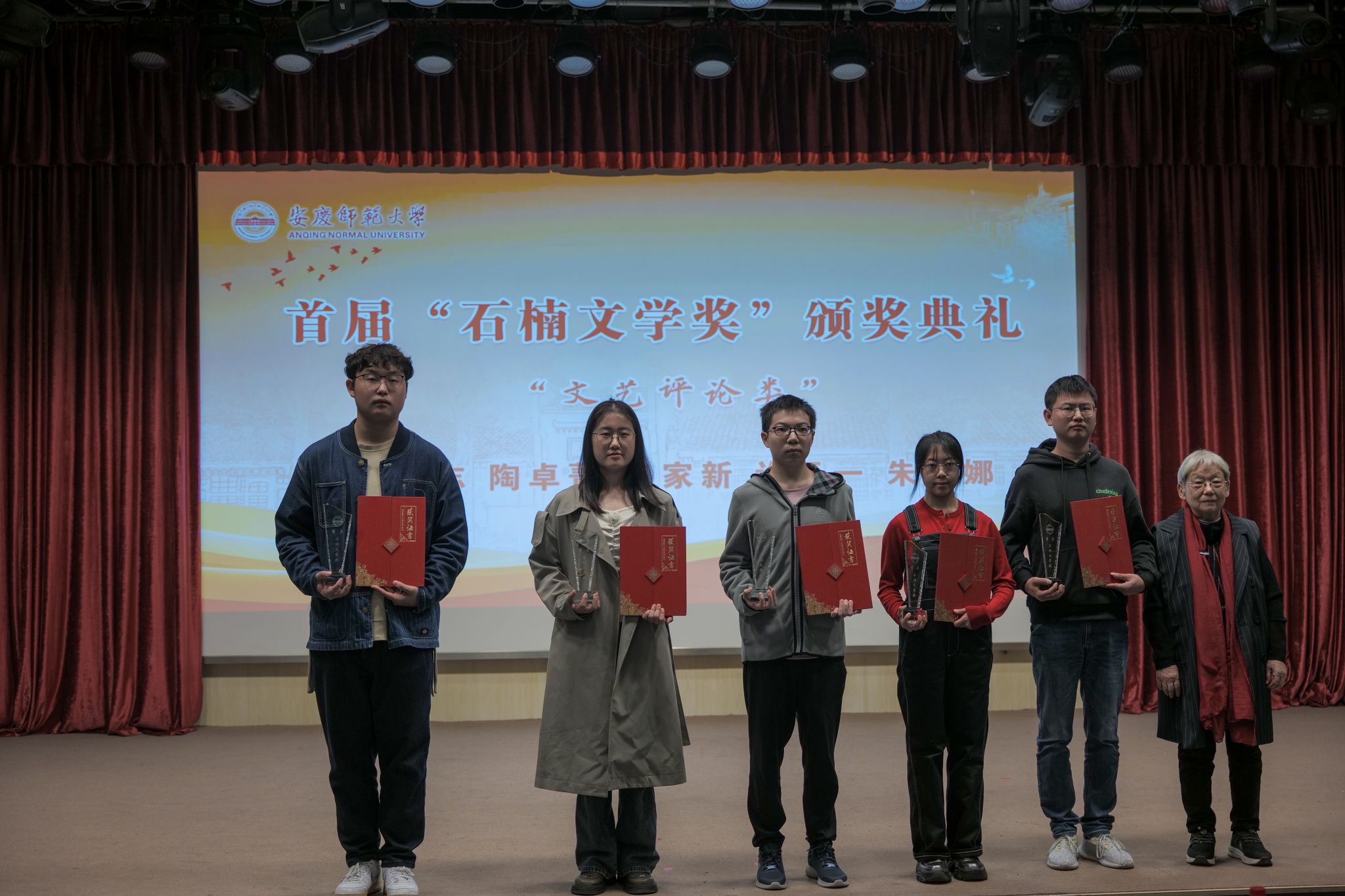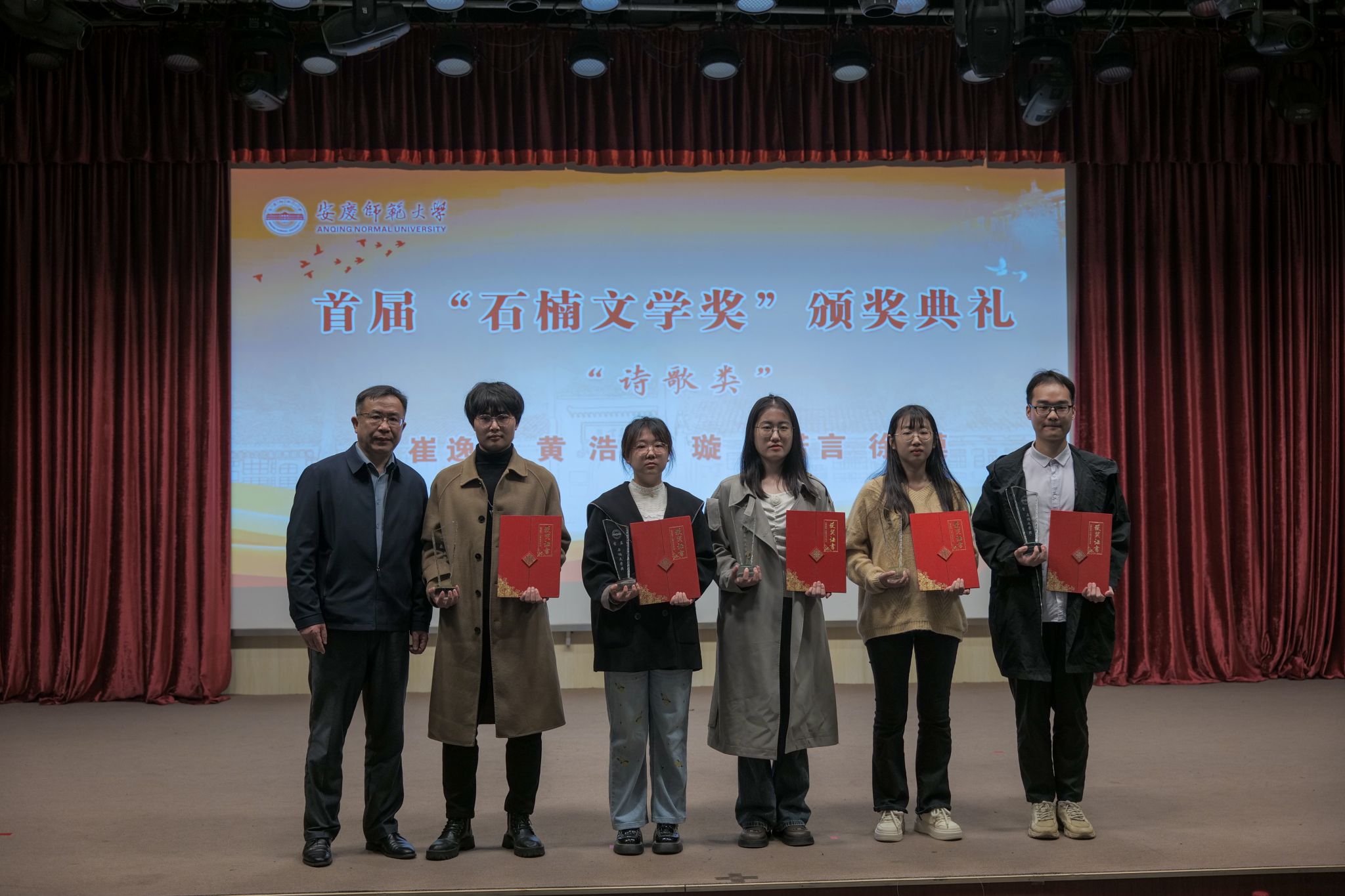 文学奖发起人、著名作家石楠先生,安徽曙光化工集团党委副书记、工会主席杨孝兵,泰邦集团董事长张志华等捐赠人,特邀嘉宾、评委代表、《诗歌月刊》主编何冰凌,安徽省作协副主席江飞,学生处、档案馆、校友总会、必威西汉姆官网平台负责人参与活动,并与首届文学奖获奖学生、必威西汉姆官网平台文典班学生等共同见证颁奖盛典。